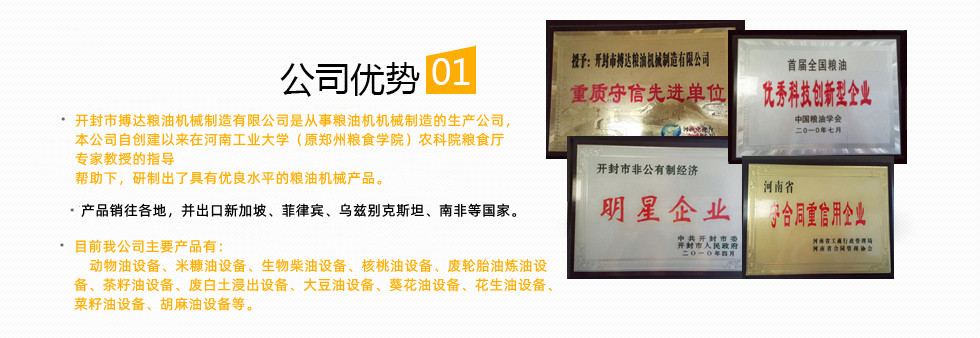 走近我們開封市搏達糧油機械制造有限公司是從事糧油機機械制造的生產公司,本公司自創(chuàng)建以來在河南工業(yè)大學(原鄭州糧食學院)農科院糧食廳專家教授的指導幫助下,研制出了具有優(yōu)良水平的糧油機械產品,產品銷往各地,并出口新加坡、菲律賓、烏茲別克斯坦、南非等國家。